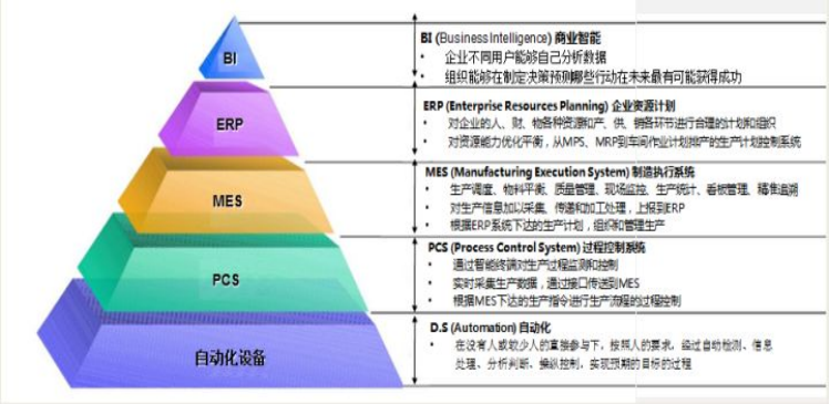 制造執(zhí)行系統(tǒng) (manufacturing execution system, 簡稱MES)旨在加強MRP計劃的執(zhí)行功能,把MRP計劃同車間作業(yè)現(xiàn)場控制,通過執(zhí)行系統(tǒng)聯(lián)系起來。這里的現(xiàn)場控制包括PLC程控器、數(shù)據采集器、條型碼、各種計量及檢測儀器、機械手等。制造執(zhí)行系統(tǒng)MES能夠幫助企業(yè)實現(xiàn)生產計劃管理、生產過程控制、產品質量管理、車間庫存管理、項目看板管理等,提高企業(yè)制造執(zhí)行能力。  企業(yè)信息化四層架構體系 MESA(制造執(zhí)行系統(tǒng)協(xié)會)提出的MES功能組件和集成模型包括11個功能,最初定義MES的時候提出,只要具備功能之中的某一個或幾個也屬MES系列的單一功能產品,正是因為這樣的定義,引發(fā)了諸多的矛盾和尷尬。  MESA定義的MES應用功能集成模型 自動化生產廠家由于具有先天的對設備、網絡的理解和基礎研發(fā)能力使得他們在數(shù)據采集方面如魚得水,而對于管理理論、管理方法輕車熟路的ERP廠商,卻對現(xiàn)場控制系統(tǒng)、數(shù)據采集,有著與生俱來的生疏和規(guī)避。隨著智能工廠的深入建設,對于MES的要求提出更高的要求,MES不僅與ERP集成,還要求與控制系統(tǒng)進行集成;不僅要求進行數(shù)據采集,還希望實現(xiàn)控制參數(shù)、工藝標準的下達。這也對自動化設備提供商和ERP廠商都提出很大的挑戰(zhàn),企業(yè)資源數(shù)據來源于工廠的多個角度,如工藝資源、制造資源、流程節(jié)點等等正是自動化設備廠商認知盲區(qū),由于兩方各不相讓造成目前智能工廠雖然發(fā)展多年依然發(fā)展緩慢或者產業(yè)規(guī)模根本就沒有起色的真正原因。 重新定義制造執(zhí)行系統(tǒng)功能要素: 1.**車間資源管理**:車間資源是車間制造生產的基礎,也是MES系統(tǒng)運行的基礎,車間資源管理主要對車間人員、設備、工裝、物料和工時等進行管理,保證生產正常進行,并提供資源使用情況的歷史記錄和實時狀態(tài)信息。 2.**生產任務管理**:包括生產任務接收與管理、任務進度展示和任務查詢等功能。提供所有項目信息,查詢指定項目,并展示項目的全部生產周期及完成情況。提供生產進度展示,以日、周和月等展示本日、本周和本月的任務,并以顏色區(qū)分任務所處階段,對項目任務時時跟蹤。 3.**車間計劃與排產**:高級排產工具(APS)結合車間資源實時負荷情況和現(xiàn)有計劃執(zhí)行進度,能力平衡后形成優(yōu)化的詳細排產計劃,提高計劃員排產效率和生產計劃準確性是優(yōu)化生產流程以及改進生產管理水平; 4.**物料跟蹤**:通過條碼技術對生產過程中的物流進行管理和追蹤,物料在生產過程中,通過條碼掃描跟蹤物料在線狀態(tài),監(jiān)控物料流轉過程,保證物料在車間生產過程中快速高效流轉,并可隨時查詢。 5.**質量管理**:生產制造過程的工序檢驗與產品質量管理,能夠實現(xiàn)對工序檢驗與產品質量過程追溯,對不合格品以及整改過程進行嚴格控制。其功能包括:實現(xiàn)生產過程關鍵要素的全面記錄以及完備的質量追溯,準確統(tǒng)計產品的合格率和不合格率,為質量改進提供量化指標。根據產品質量分析結果,對出廠產品進行預防性維護 6.**生產過程管理**:生產過程中采用條碼、觸摸屏和機床數(shù)據采集等多種方式實時跟蹤計劃生產進度,生產過程管理旨在控制生產,實施并執(zhí)行生產調度,追蹤車間里工作和工件的狀態(tài),對于當前沒有能力加工的工序可以外協(xié)處理。實現(xiàn)工序派工、工序外協(xié)和齊套等管理功能,可通過看板實時顯示車間現(xiàn)場信息以及任務進展信息等。 7.**生產監(jiān)控**:生產監(jiān)控實現(xiàn)從生產計劃進度和設備運轉情況等多維度對生產過程進行監(jiān)控,實現(xiàn)對車間報警信息的管理,包括設備故障、人員缺勤、質量及其他原因的報警信息,及時發(fā)現(xiàn)問題、匯報問題并處理問題,從而保證生產過程順利進行并受控; 8.**統(tǒng)計分析**:能夠對生產過程中產生的數(shù)據進行統(tǒng)計查詢,分析后形成報表,為后續(xù)工作提供參考數(shù)據與決策支持. 隨著時間推移,市面逐漸推出由專業(yè)數(shù)據采集設備提供商與ERP研發(fā)企業(yè)聯(lián)合研制的”ERP+MES的精益制造解決方案“,打破兩個行業(yè)各不相讓的尷尬局面,ERP研發(fā)商在大數(shù)據的基礎上將精益生產管理思想進一步滲入企業(yè)管理,精益生產管理思想得到進一步升華。相比單純的ERP或者MES,精益制造管理系統(tǒng)在企業(yè)落地方面更具有可操作性,在汽車、家電等裝配行業(yè),企業(yè)基本可以實現(xiàn)JIT、JIS管理。  互聯(lián)協(xié)議轉換器實現(xiàn)設備與服務器互聯(lián)互通  食品醫(yī)藥中的數(shù)據采集  實現(xiàn)現(xiàn)場數(shù)據與服務器數(shù)據交換 案例展示: 1.汽車電裝公司實景 地址:四川.成都 產品:汽車各類啟動電機、交流電機  生產車間電子看板 ` 現(xiàn)場調度平臺對生產線進行切換和監(jiān)控 亮點: (1).生產現(xiàn)場和物流倉儲采用大屏幕電子看板實現(xiàn)生產計劃和物料需求試試監(jiān)控和有效拉動; (2).線邊庫存保持在一小時用量,每日完工后線邊庫存剛好消耗完畢,整個現(xiàn)場干凈有序,整體效率提升30%; (3).每日生產計劃及時完成率達到90%以上,倉庫存貨降低30%,